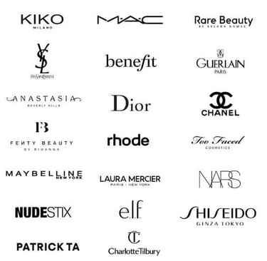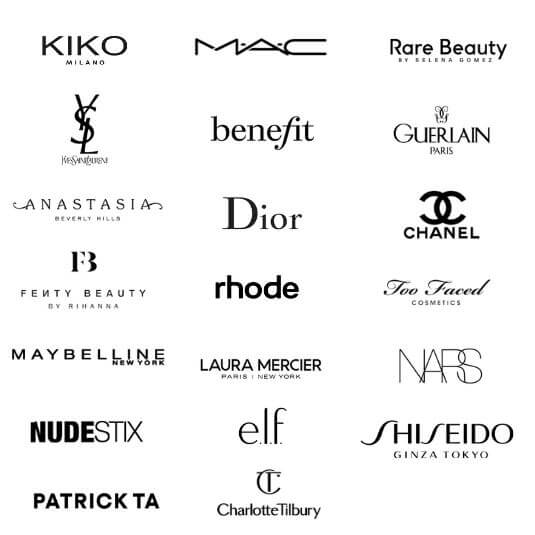 Dior, MAC, Chanel, YSL, Rare Beauty, Fenty Beauty, Too Faced, Benefit, Guerlain, Loreal, Sheglam, Maybelline, Kiko, Rhode, Laura Mecier, Nars.